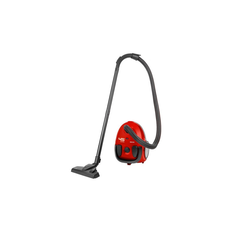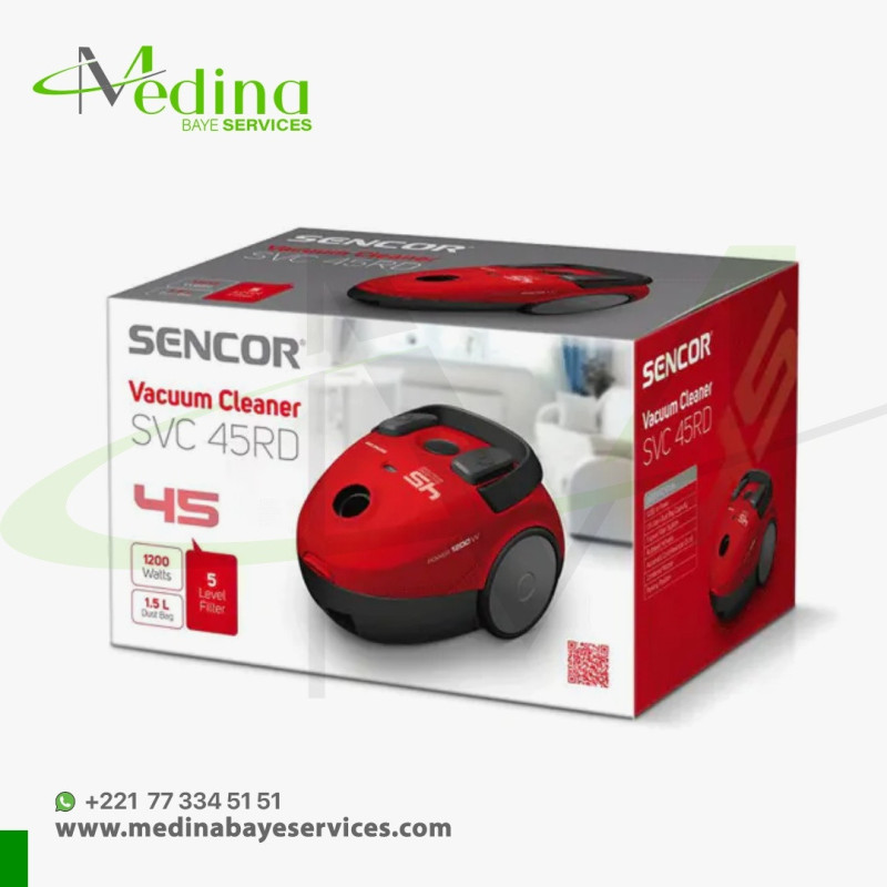 Aspirateur avec sac Sencor SVC 45RD-MEG2 – moteur 1200W, filtre HEPA, sac grande capacité, câble 5m avec enrouleur, brosses et accessoires. Compact, silencieux, puissant, idéal pour sols durs, tapis, meubles et coins difficiles. Design rouge élégant, faible consommation, système de filtration haute performance, rayon d’action 7,5 m, roulettes multidirectionnelles, parfait pour un nettoyage quotidien rapide et hygiénique.