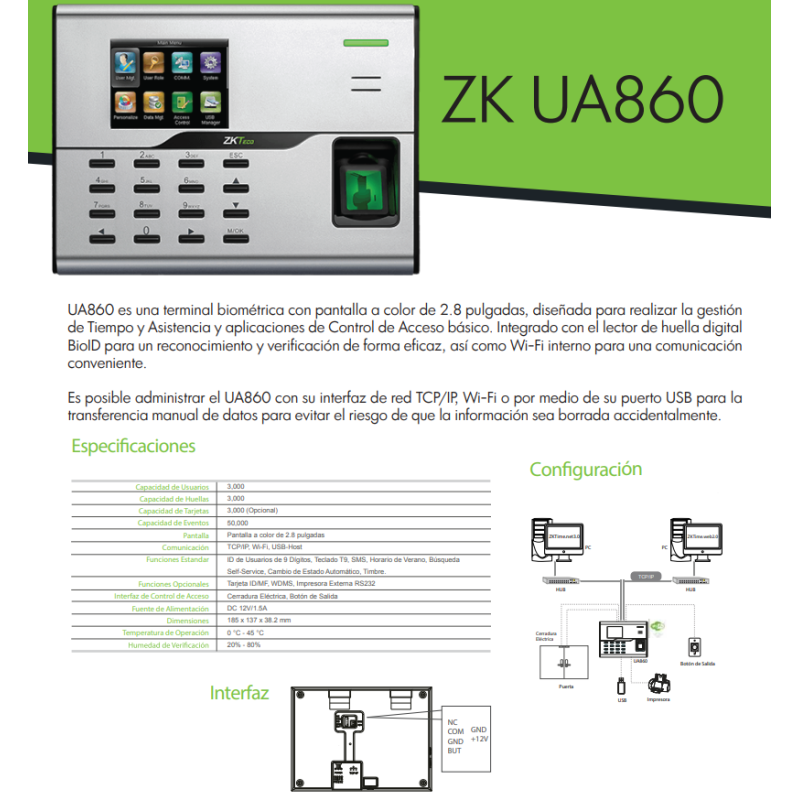 Capacité de l’utilisateur: 3000 Capacité d’empreinte digitale: 3000 Capacité de la carte: 3000 Capacité d’enregistrement: 50,000 Montrer: Écran couleur 2.8'' Communication: TCP/IP, WiFi, hôte USB Fonctions standard: ID utilisateur à 9 chiffres, entrée T9, SMS, DST, requête en libre-service, commutateur d’état automatique, sonnerie, imprimante externe RS232 Interfaces de contrôle d’accès: 3rd Party Electric Lock, bouton de sortie Logiciels pris en charge: ZKTime.Net 3.0, heure ZKBio Alimentation: DC 12V / 1.5A Dimension: 185 * 137 * 38.2mm (LxlxH) Température de fonctionnement: 0 °C - 45 °C Humidité de fonctionnement: 20% - 80%