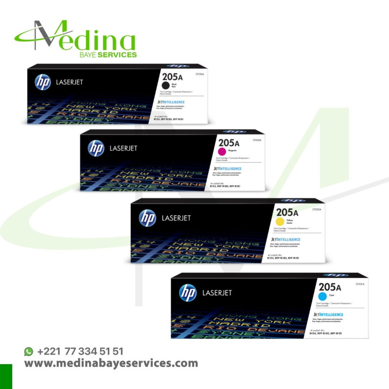 Type de produit : Cartouche d'Encre, Modèle : HP 205A, Couleur : BLACK/CYAN/YELLOW/MAGENTA ,Technologie d'impression : Laser, Rendement : 1100 pages/Toner ,Compatibilité : Imprimante LaserJet M154, MFP M180, MFP M181 Poids : 0.75 kg / Toner
